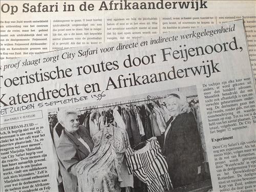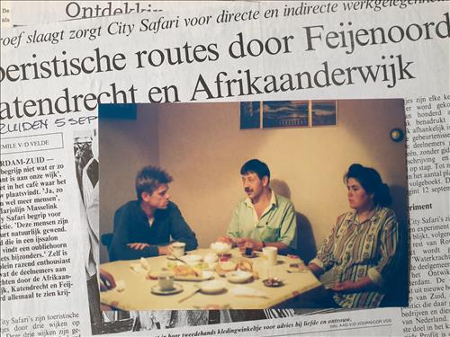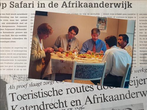 Na het denken kwam het doen: de Proefsafari. De inkt van de plannen was nog niet droog of ik griste uit puur enthousiasme het plan voor een reis door eigen stad van het bureau van Kees. Ik ging op reis, gewapend met de vraag: zou je het leuk vinden op bezoek te ontvangen. ‘Ja’ zei de familie Surucu, waar oma net mantu aan het maken was. ‘Ja’ zei Jan van der Stel die op de stoep een wasmachine uit elkaar aan het halen was en van de opbrengst van de onderdelen de huur van zijn oorlogsmuseum kon betalen. ‘Ja’ zei de Kocatepe Moskee waar vader Surucu mij mee naar toe nam. In no time had ik veertig enthousiaste gastvrouwen en gastheren, dus de bezoekers konden komen. 250 mensen kwamen de brug over: beroepsmatig geïnteresseerden, waaronder wethouder Hans Kombrink, politiecommisaris Jan Willem Brinkman en projectleiders Wederzijds Profijt Gert-Jan Meijer en Frank Belderbos, lieve maar kritische vrienden en nieuwe bewoners van de Kop van Zuid. De programma’s waren lang, te lang soms, maar het enthousiasme van de bezoekers en ontvangers was groter. Kees en ik wisten het zeker: hier gaan we mee door! En we noemden het nieuw te ontwikkelen bedrijf City Safari, op reis door de Grote Stad.